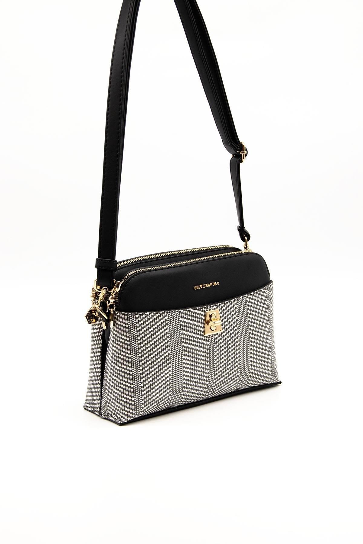Silver & Polo SP623 Kadın Çapraz Çanta Hasır Siyah Beyaz-Siyah